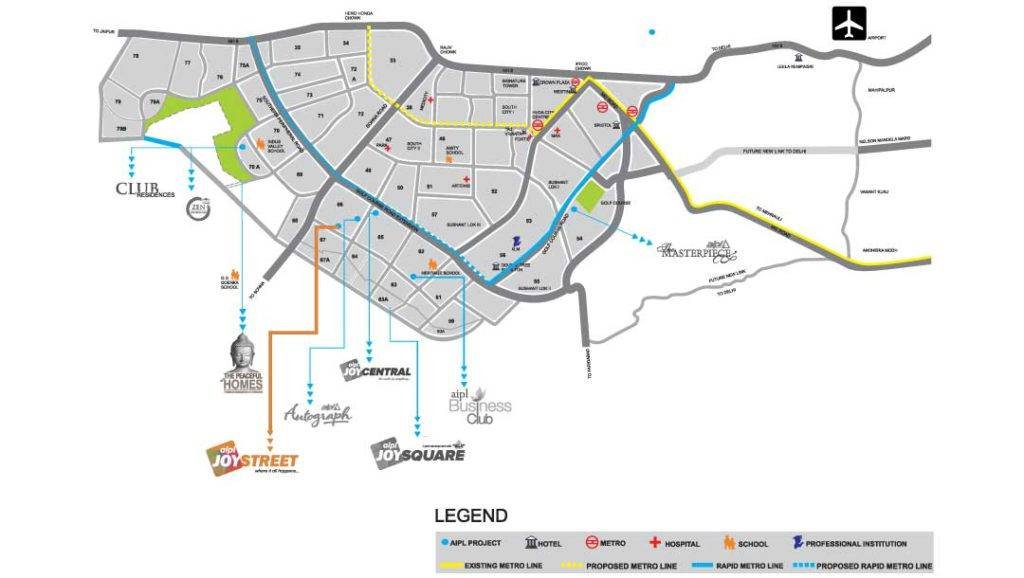 AIPL Joy Street is the one-stop entertainment hub for the residents of Gurgaon. Located in sector 66 on a 4-acre site, the open concept mall enjoys a prime location with several residential projects in the vicinity. The planning of Joy Street was a keen design challenge with a uniquely shaped site – the main parameters of planning being greater visibility and therefore primeness to all shops and an experiential shopping destination with greater imageability that aroused interest and excitement in the shopper has been provided. The nonlinear design increased the frontage of retail space dividing it into primary secondary and tertiary spaces; this along with different areas of shops gives a diverse array of retail spaces. The carefully designed open courts and piazzas serve as nodes which brings a strong character to this project. The fifth to eighth floors have dedicated office spaces with convertible areas and a wide array of amenities.