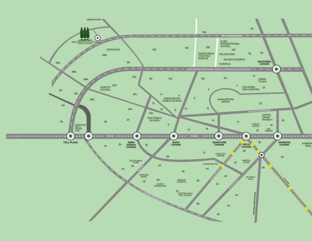 Spiti Greenwood Estate has wide, strategically streets lines with canopied trees. reenwood Estate homes provide you with simple, classy and boundary less lifestyle making it the foremost admirable feature of this residential project. It also redefines the concept of luxury with a lush green environment with an in-depth proximity to the urban amenities of the town .At a particular location of sector 99a on the Dwarka Expressway of Gurgaon, Spiti Greenwood Estate Plots residential project has an simple accessibility from metro stations, domestic & international airport and various major points of Delhi & Gurgaon.At life during this awesome dream home, you’d never be far away from the important places like schools, colleges, corporate offices, restaurants, hotels and lots of more.